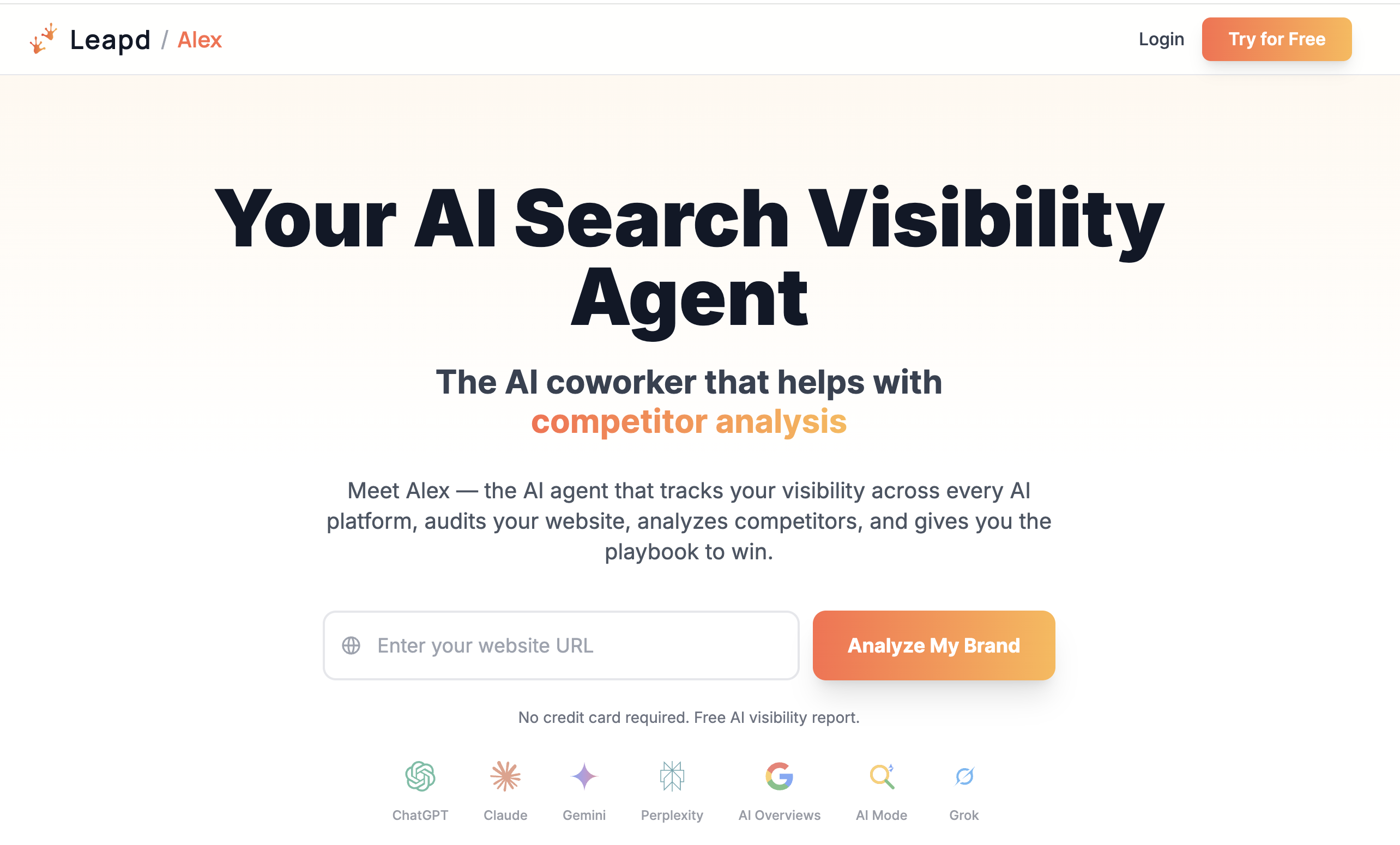 Alex by Leapd is the only tool on this list that combines AI visibility tracking, a full website AI audit, competitor intelligence, content generation, and a live AI copilot strategist in a single platform — without the enterprise price tag.