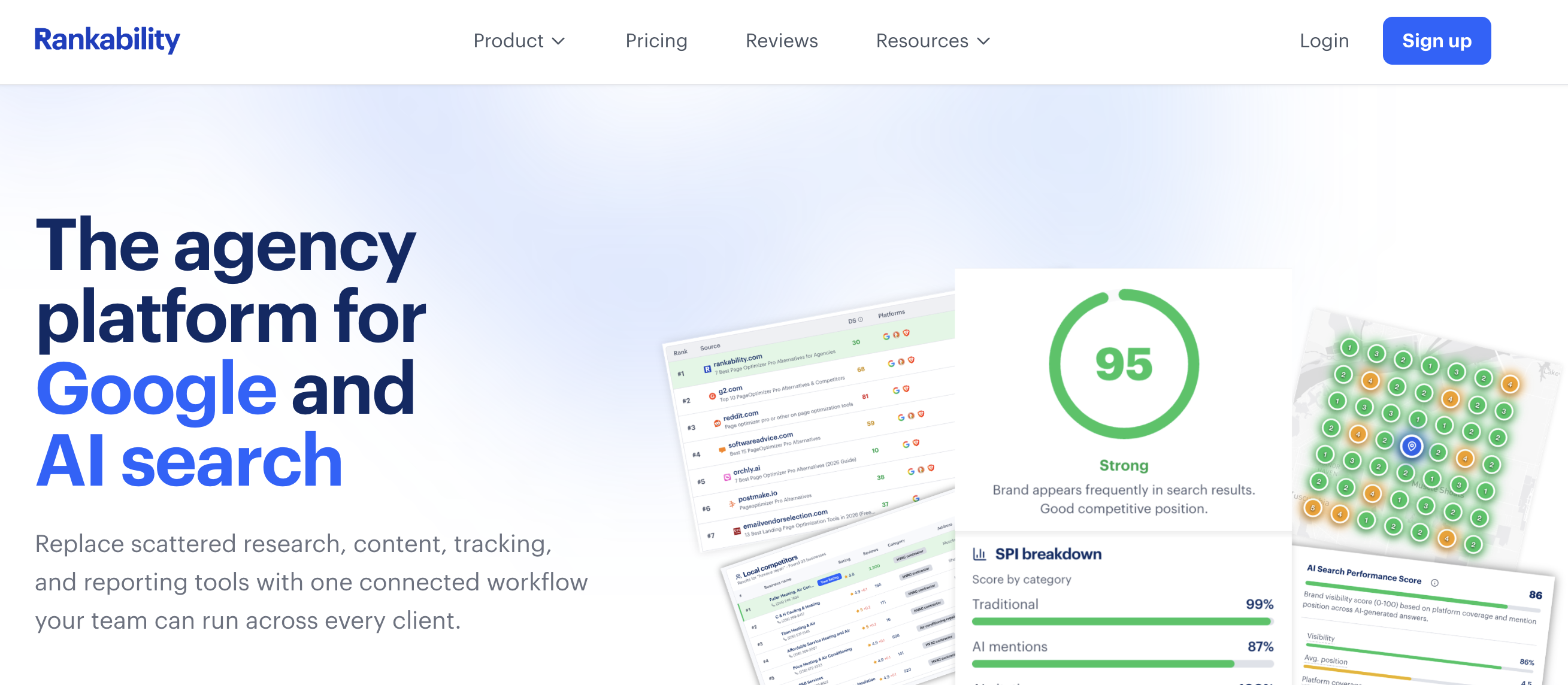 Rankability is an AI SEO platform built specifically for agencies, combining its Reporter rank tracking tool with AI visibility across traditional search and AI platforms including Google AI Mode. White-label reporting, revenue attribution, and mid-market pricing make it a practical choice for agencies managing multiple client brands simultaneously — without the enterprise overhead of platforms like Profound or Scrunch.