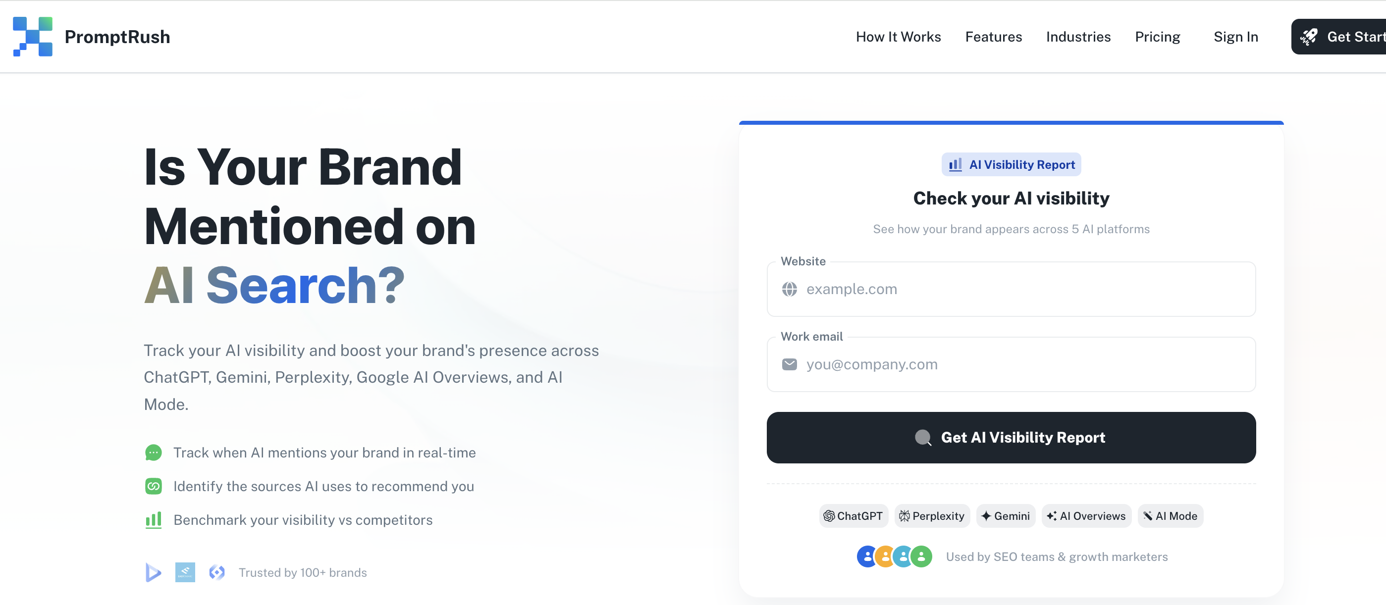 PromptRush provides focused tracking of brand mentions across ChatGPT, Claude, Gemini, and other AI platforms. It works as a straightforward AI rank tracker — showing where you appear, what prompts triggered the mentions, and how you compare to competitors — with a dashboard designed for quick, recurring reviews rather than deep analytical workflows.