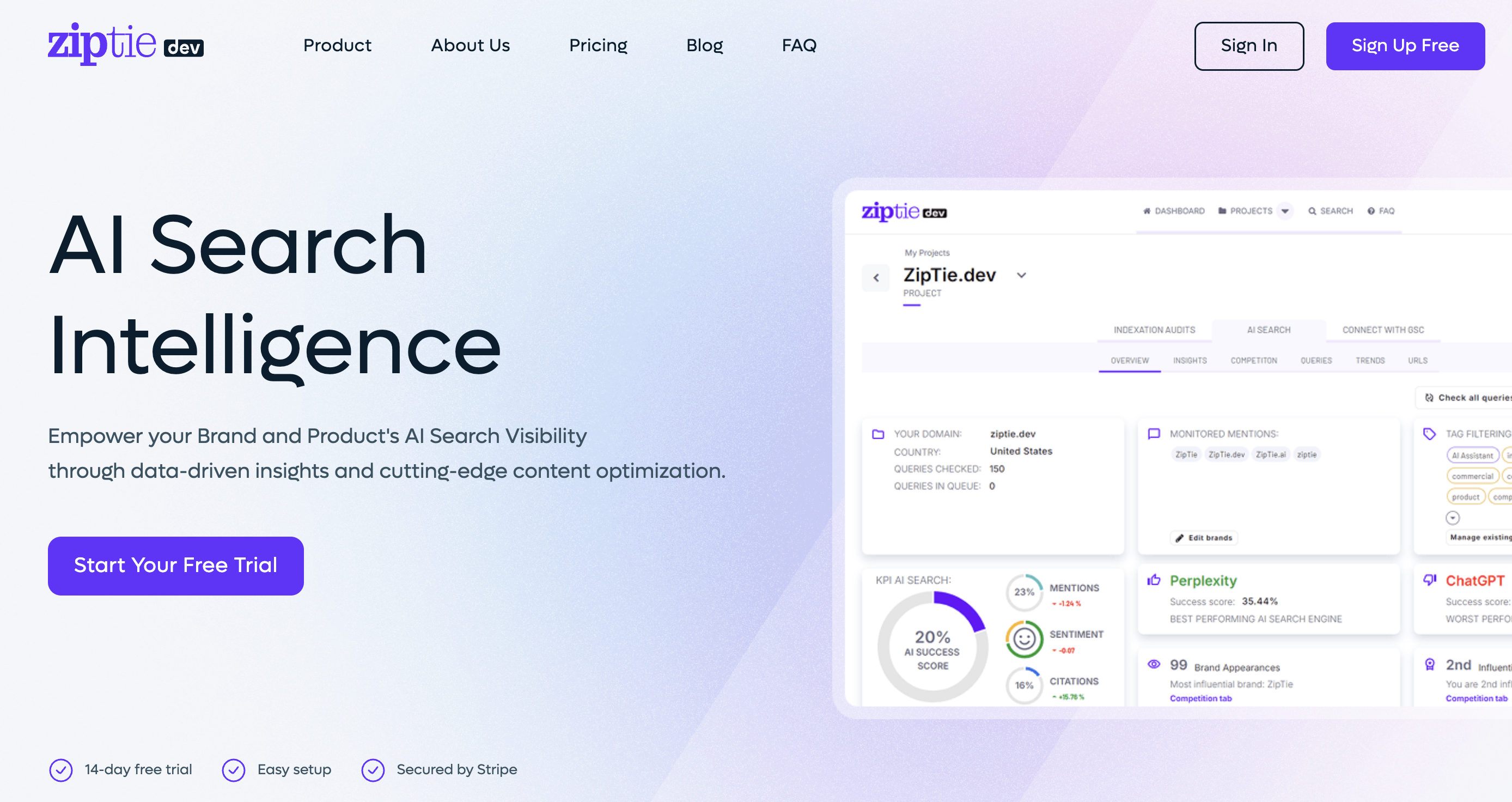 ZipTie positions itself specifically as the bridge between visibility monitoring and content execution — the "now what?" answer that pure tracking tools leave unanswered. Its content optimization module identifies specific citation gaps and delivers strategic recommendations for earning AI mentions, not just reporting them. Covers ChatGPT, Perplexity, Gemini, Claude, and more with a content optimization layer included from the entry plan.