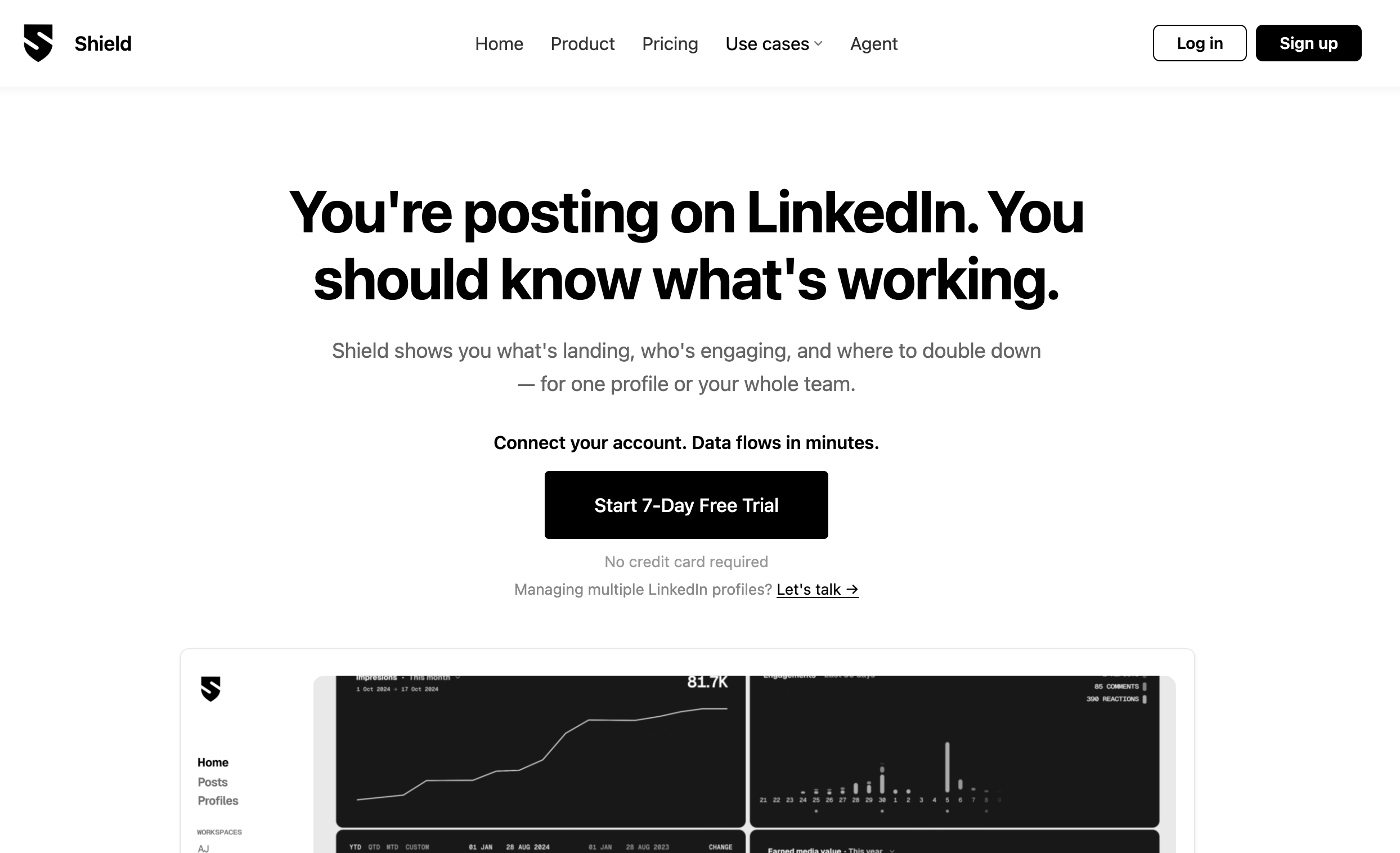 Shield is a LinkedIn-specific analytics platform trusted by 10,000+ creators and teams in 50+ countries. It solves a specific problem that every serious LinkedIn creator hits: native LinkedIn analytics are shallow, don't show historical trends, and disappear when you post a new update.