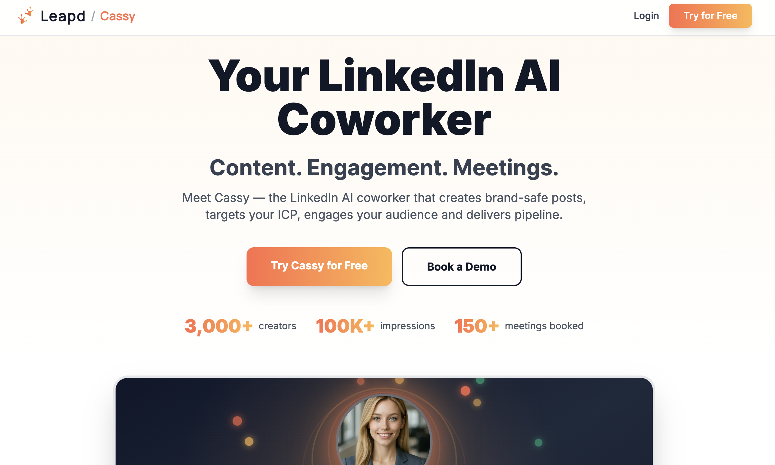 Social proof: Used by 3,000+ creators, Cassy has directly generated 150+ booked meetings and driven 100K+ impressions. The 300% engagement lift translates to pipeline outcomes: meetings booked, not just vanity metrics.
