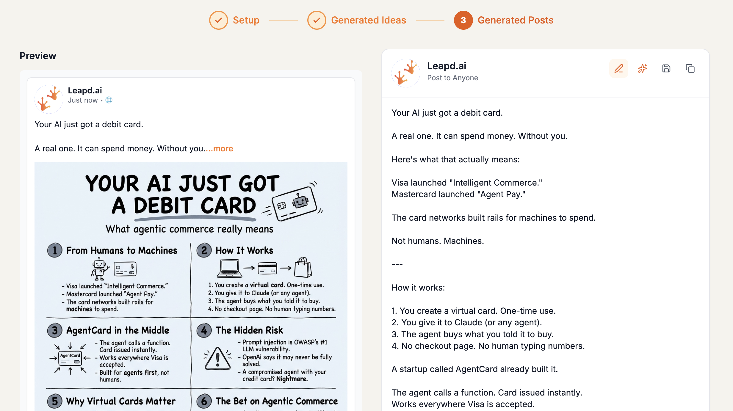 - Convert any URL, PDF, YouTube video, or blog post into a LinkedIn-ready post with one click