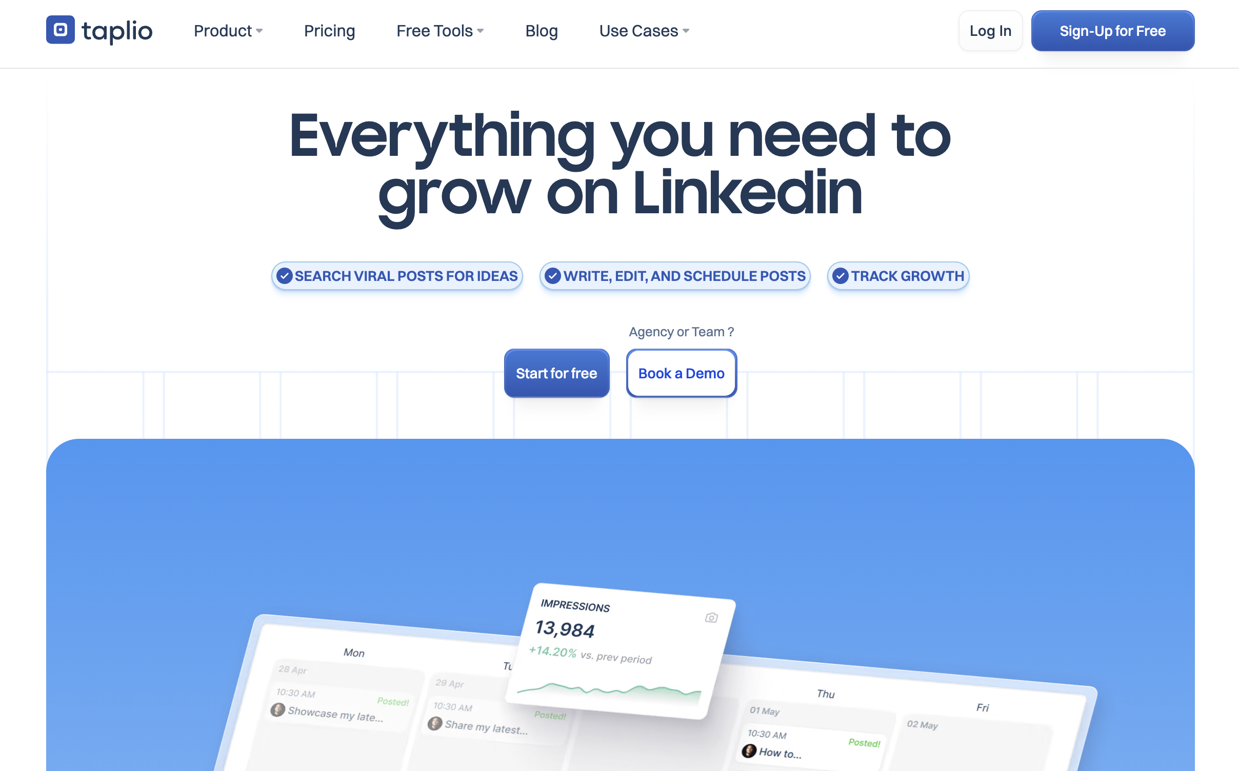 Taplio is a LinkedIn content tool focused on scheduling, post analytics, and basic AI-assisted drafting. It's a solid option for individual creators and personal brands who want to maintain a consistent posting rhythm and track which content performs best.